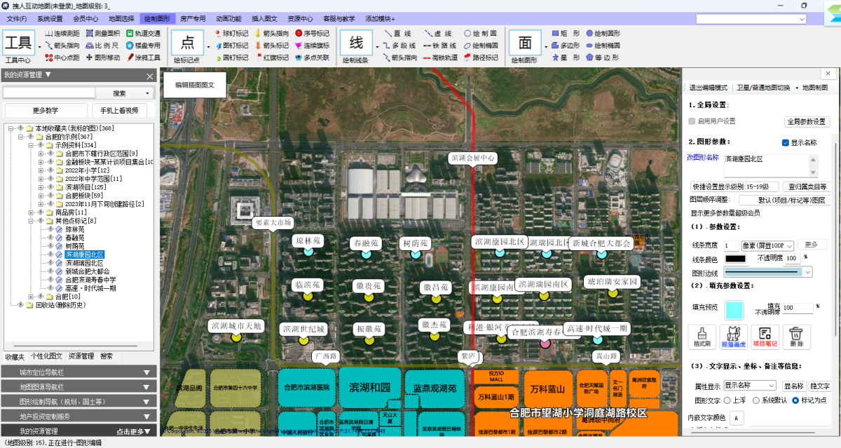 (2)地图绘制功能:包括点编辑、线编辑、面编辑。 其中点标记包括,球钉标记、图钉标记、圆钉标记、旗帜标记、箭头标记、红旗标记、序号标记、连续符号标记、多点关联标记等 其中绘制线条又包括,直线、虚线、园、椭圆、多段线、铁路线、绘制椭圆、绘制箭头指向、绘制高铁线路、路径沿点标记等 其中绘制图形包括矩形,多边形、星形状(如五角星、六角形等)、绘制圆形、绘制椭圆、绘制等边形(墨卡托地图平面像素等边)等